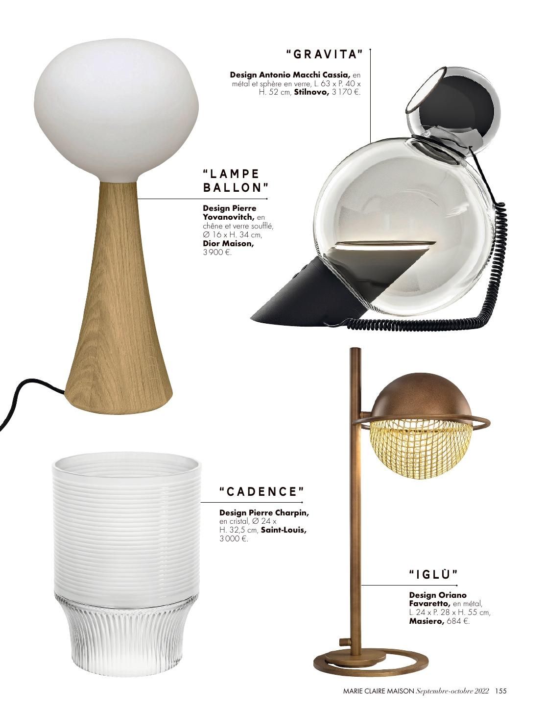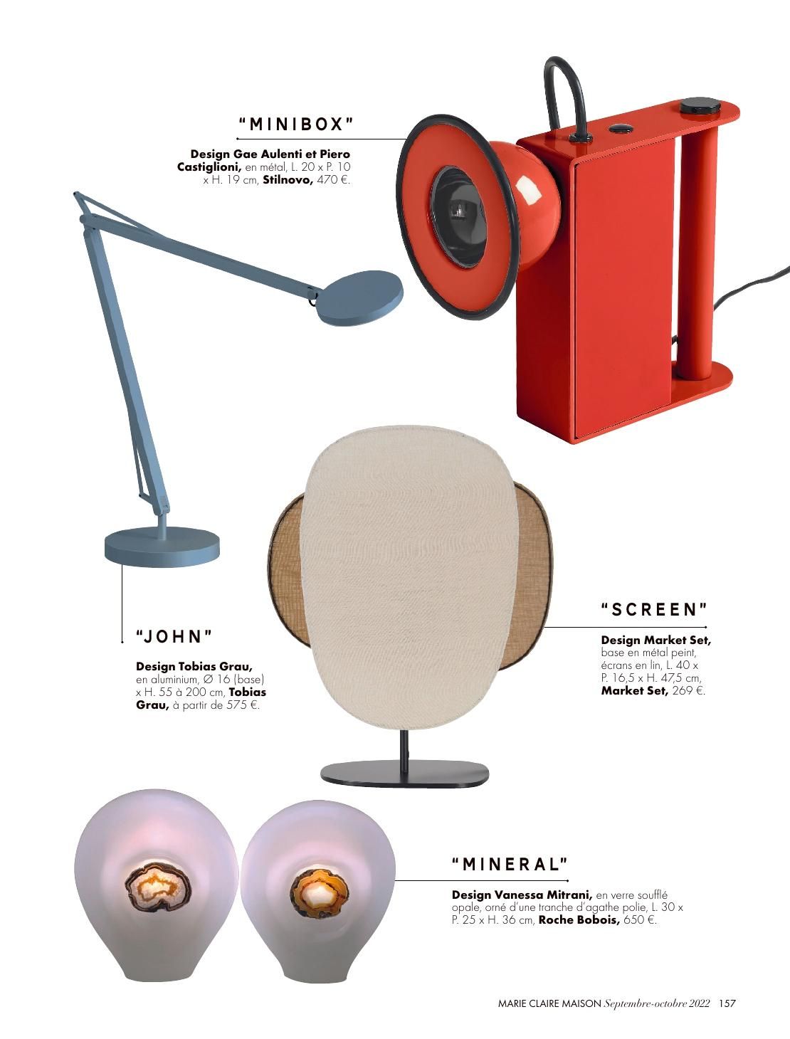 Stilnovo’s reissued Minibox and Gravitá table lamps get an honorable mention in the October issue of Marie Claire Maison.